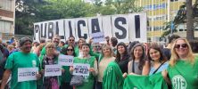 Sectores de la comunidad educativa y organizaciones del campo popular nos concentramos en la Plaza de la Memoria del complejo y desde allí, con carteles que rezaban “Pública Sí”, marchamos alrededor del edificio en señal de protesta contra las propuestas de La Libertad Avanza.
